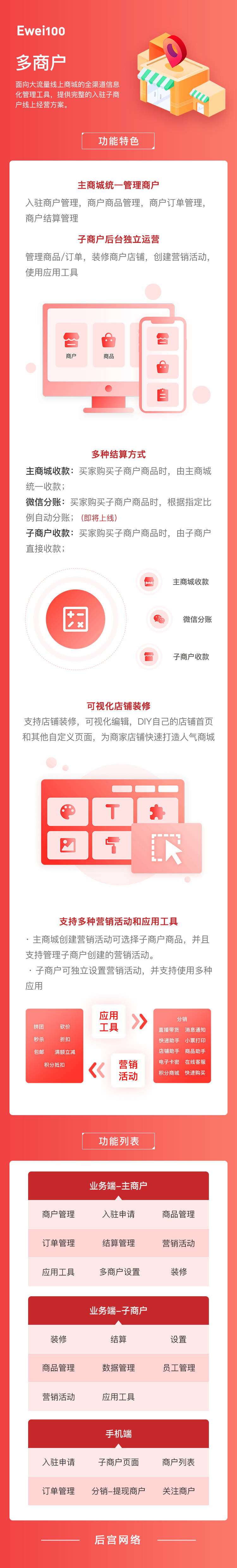 为商家提供完整的入驻子商户线上经营方案。